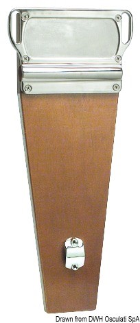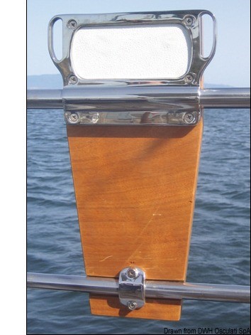 Adatto a tubi Ø 25/30 mm. Composto da una piastra in acciaio inox AISI 316 lucidato + morsetto inox per tubo intermedio + tavola in compensato marino verniciato.